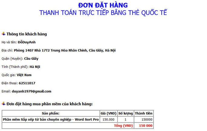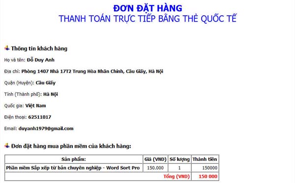 Hình thức Thanh toán trực tiếp bằng thẻ quốc tế là hình thức Quý khách hàng sẽ gửi trả tiền thanh toán hóa đơn hàng cho công ty qua chuyển khoản trực tiếp sử dụng thẻ thanh toán quốc tế Visa, Master, ... qua cổng thanh toán quốc tế của công ty OnePay (Truy cập địa chỉ www.onepay.vn để tìm hiểu thêm thông tin về cổng thanh toán quốc tế). Sau khi nhận được tiền thanh toán của Quý khách hàng, công ty sẽ tiến hành gửi mã bản quyền sử dụng phần mềm tới địa chỉ email hoặc điện thoại khách hàng đã đăng ký. Để lựa chọn hình thức thanh toán trực tiếp sử dụng thẻ thanh toán quốc tế Visa - Master, Quý khách hàng nhấn nút Thanh toán trực tiếp bằng thẻ Quốc tế 4. Bước 4: Xác nhận thanh toán:- Đơn hàng đặt mua phần mềm thanh toán trực tiếp bằng thẻ nội địa của Quý khách hàng xuất hiện.