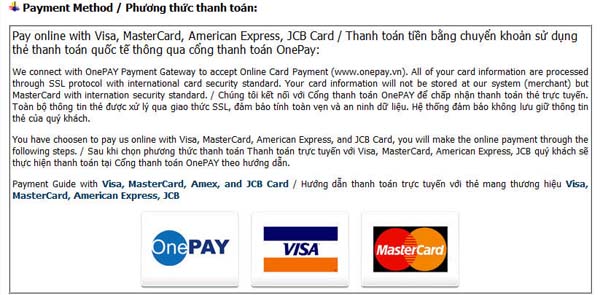 - Hướng dẫn thanh toán trực tuyến với thẻ mang thương hiệu Visa, MasterCard, American Express, - Payment Guide with Visa, MasterCard, Amex, and JCB Card 6. Bước 6: Nhận kết quả thanh toán:Khi hoàn thành các bước thanh toán, Quý khách sẽ được thông báo về kết quả giao dịch. Quý khách sẽ chờ trong vài giây để nhận kết quả xử lý từ cổng thanh toán. Chúng tôi sẽ gửi email xác nhận đơn hàng và kết quả thanh toán thành công cho quý khách.