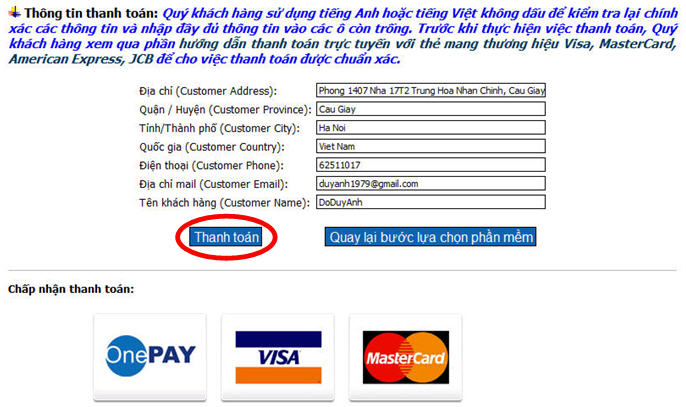 Khi Quý khách hàng lựa chọn Quốc gia/Country nơi mình đang sinh sống không phải Việt Nam thì mặc định việc thanh toán của Quý khách hàng sẽ sử dụng hình thức thanh toán bằng ngoại tệ - USD 3. Bước 3: Lựa chọn hình thức thanh toán:- Đơn hàng đặt mua phần mềm của Quý khách hàng xuất hiện. Quý khách hàng cần kiểm tra lại chính xác các thông tin về khách hàng như điện thoại, email, tên phần mềm và số lượng phần mềm, tổng tiền, ... để việc gửi mã bản quyền sử dụng phần mềm tới khách hàng được nhanh chóng. Mã bản quyền sử dụng phần mềm sẽ được gửi tới khách hàng bằng một trong hai hình thức: qua email hoặc qua tin nhắn điện thoại sms.