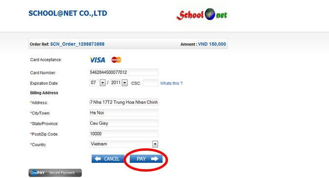 Nhấn nút Thanh toán. Toàn bộ thông tin đơn hàng của Quý khách sẽ được chuyển trực tiếp lên cổng thanh toán thẻ nội địa của công ty OnePay đồng thời đơn đặt hàng của Quý khách cũng sẽ được gửi tới công ty School@net. Công ty School@net kết nối với Cổng thanh toán OnePAY để chấp nhận thanh toán thẻ trực tuyến. Toàn bộ thông tin thẻ được xử lý qua giao thức SSL, đảm bảo tính toàn vẹn và an ninh dữ liệu. Hệ thống đảm bảo không lưu giữ thông tin thẻ của quý khách.