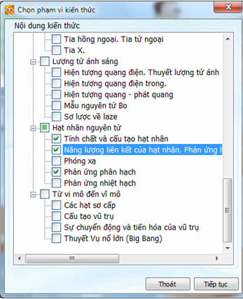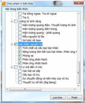 Để chọn chủ đề kiển thức cần kiểm tra hãy nháy lựa chọn Câu hỏi chính thức trong cửa sổ trên và nháy vào nút . Xuất hiện màn hình chọn phạm vi kiến thức quen thuộc.