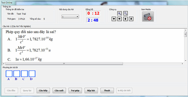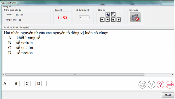 Nháy nút Bắt đầu. Giao diện của chức năng Kiểm tra thử tương tự như hình thức Kiểm tra Chuẩn. Tức là có thể thực hiện làm bài theo giao diện như màn hình dưới đây. Đồng hồ thời gian sẽ bật để học sinh quan sát được thời gian đã làm bài và thời gian còn lại.