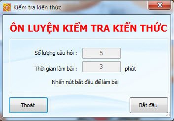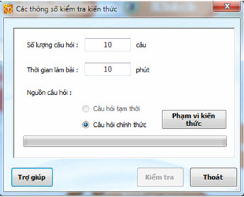 Có thể chọn một hay nhiều chủ đề kiến thức. Nháy nút Lựa chọn để kết thúc và quay về màn hình Các thông số kiểm tra kiến thức. Tại cửa sổ này sau khi đã lựa chọn xong các thông số, nháy nút Kiểm tra để thực hiện lệnh. Cửa sổ sau xuất hiện.