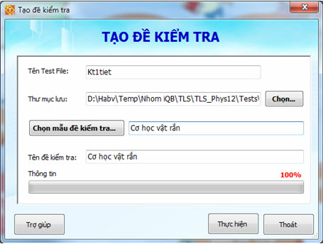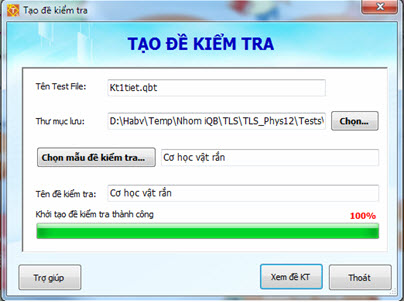 - Nhập tên đề kiểm tra. Chỉ cần nhập tên, phần mở rộng sẽ tự động là *.qbt. - Nhập thư mục lưu trữ đề kiểm tra này. - Nhập Tên đề kiểm tra sẽ in ra giấy. - Nháy nút để vào màn hình lựa chọn các mẫu đề kiểm tra có sẵn trong phần mềm. - Nháy nút Thực hiệnđể sinh đề kiểm tra. Sau khi sinh xong, màn hình sẽ có dạng như hình dưới đây: