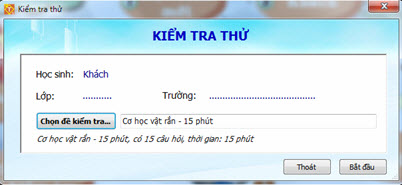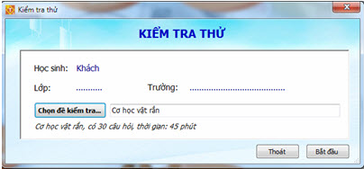 Muốn in nháy nút trên thanh công cụ của màn hình trên. 6. Kiểm tra thử Chức năng kiểm tra thử gần giống hoàn toàn chức năng Kiểm tra định kỳ, điểm khác duy nhất là điểm số không được lưu lại trong số học bạ của học sinh. Để thực hiện chức năng này không cần Đăng nhập vào phần mềm. Giao diện màn hình chính như sau: