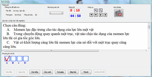 Chọn xong nháy nút Tiếp tục. Tiếp theo sẽ xuất hiện giao diện làm bài kiểm tra trực tuyến như hình dưới đây.