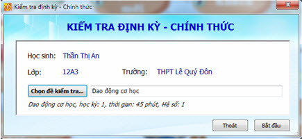 Khi kết thúc quá trình kiểm tra thử, điểm số sẽ không được lưu lại. 7. Kiểm tra định kỳ Chức năng Kiểm tra định kỳ là chức năng quan trọng nhất của phần mềm Kiểm tra và Ôn luyện kiến thức TLS. Chức năng này cho phép các HS đã đăng nhập trong phần mềm tiến hành bài kiểm tra định kỳ chính thức theo đúng mẫu của Bộ GD&ĐT. HS sẽ phải chọn mẫu đề kiểm tra tương ứng và thực hiện một bài kiểm tra trắc nghiệm hoàn chỉnh trên máy tính. Kết quả của bài kiểm tra này sẽ được lưu vào “Học bạ” của HS này dùng để tính điểm Trung bình môn của học sinh vào cuối học kỳ và cuối năm học. Giao diện ban đầu của lệnh có khuôn dạng gần giống lệnh Kiểm tra thử, điểm khác biệt là trên màn hình này ghi rõ tên HS đã đăng nhập trong phần mềm.