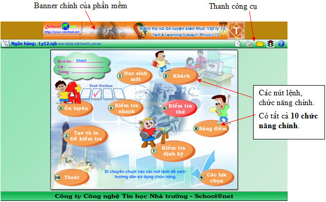 Các chức năng chính của phần mềm: - Phần mềm cho phép người dùng thực hiện việc ôn luyện và làm bài kiểm tra nhanh theo các chủ đề kiến thức của môn học tương ứng, theo từng bài học của SGK môn học tương ứng. - Cho phép khởi tạo và in ra giấy các đề kiểm tra định kỳ theo đúng mẫu và chuẩn của Bộ Giáo dục và Đào tạo. Các đề kiểm tra định kỳ này có thể là bất kỳ trắc nghiệm, tự luận. - Cho phép kiểm tra thử trực tuyến trên máy tính không lấy điểm theo các mẫu đề kiểm tra định kỳ môn học. Đối với các Học sinh đã đăng ký và đăng nhập vào phần mềm, phần mềm sẽ cho phép: - Tiến hành Kiểm tra định kỳ chính thức theo các mẫu đề chuẩn của Bộ Giáo dục & Đào tạo, điểm số được lưu trong Học bạ cá nhân của học sinh này. - Học sinh được phép kiểm tra lại nhiều lần với đề được sinh ngẫu nhiên để đạt điểm tốt hơn. Phần mềm như một Gia sư cần mẫn sẽ tự động tính điểm Trung bình môn học cho học sinh theo học kỳ và cả năm học. Sổ học bạ sau đó có thể in ra giấy. 2. Giao diện chính Giao diện chính của các phần mềm TLS có dạng như hình dưới đây. Hình ảnh của phần mềm Kiểm tra và Ôn luyện kiến thức Vật lí 12. Trên giao diện chính của phần mềm chúng ta thấy: - Phía trên cùng là Banner chính ghi tên phần mềm chính. - Dưới Banner là thanh công cụ nhỏ. - Giao diện chính của phần mềm thể hiện chính giữa màn hình, trên đó chúng ta sẽ thấy 10 nút lệnh tương ứng với 10 chức năng chính của phần mềm. Thanh công cụ Thanh công cụ chứa 1 số lệnh như sau: