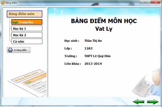 Mỗi HS khi đăng nhập vào phần mềm sẽ sử dụng một mẫu bảng điểm riêng của mình. Các bảng điểm này được sao chép tự động từ một Bảng điểm Hệ thống duy nhất của phần mềm. Chức năng này sẽ cho phép người dùng được thay đổi thông tin và các thuộc tính của Bảng điểm HS cũng như Bảng điểm Hệ thống. Giao diện nhập, sửa thông tin của một bảng điểm có dạng như hình sau: