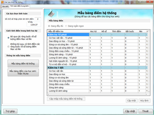 HS có thể xem điểm của Học kỳ I, Học kỳ II và Cả năm, có thể thực hiện nhanh việc tính điểm trung bình môn học ngay trong lệnh này. Học bạ có thể in ra máy in. 9. Các lựa chọn Chức năng Các lựa chọn cho phép nhập, sửa các thông tin hệ thống của phần mềm, trong đó thông tin quan trọng nhất là cách tính điểm TB môn học và hệ số của các mẫu đề kiểm tra sẽ dùng để tính điểm TBMon. Mô hình các mẫu bảng điểm trong phần mềm TLS được mô tả trong sơ đồ sau: