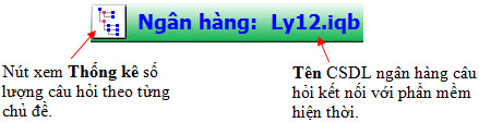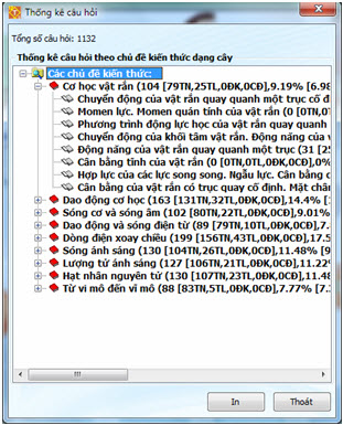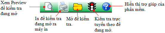 Nháy lên nút Thống kê câu hỏi sẽ hiện cửa sổ thống kê như hình dưới đây.  Các nút lệnh bên phải thanh công cụ có ý nghĩa như sau:  10 chức năng chính Bảng sau mô tả ngắn gọn ý nghĩa của các chức năng chính của phần mềm. | Stt | Chức năng | Điều kiện thực hiện | Mô tả ý nghĩa | | 1 | Học sinh mới | Không điều kiện | Đăng ký HS mới hoặc đăng nhập với HS đã được đăng ký. | | 2 | Khách | Không điều kiện | Chuyến sang chế độ người dùng là Khách. Nếu là Khách sẽ không thực hiện được các chức năng 7 và 8. | | 3 | Ôn luyện | Không điều kiện | Chức năng cho phép làm liên tục các câu hỏi trắc nghiệm trong CSDL lấy từ các chủ đề kiến thức được chọn trước. Chức năng này dùng để học sinh ôn luyện kiến thức hàng ngày. | | 4 | Kiểm tra nhanh | Không điều kiện | Chức năng cho phép thực hiện bài kiểm tra nhanh theo các chủ đề kiến thức được chọn trước. | | 5 | Tạo và in đề kiểm tra | Không điều kiện | Chức năng khởi tạo nhanh các đề kiểm tra theo mẫu có sẵn và in các đề này ra máy in. | | 6 | Kiểm tra thử | Không điều kiện | Chức năng tiến hành kiểm tra gần như chính thức nhưng không lấy điểm vào học bạn. | | 7 | Kiểm tra định kỳ | Cần đăng nhập vào phần mềm | Chức năng kiểm tra định kỳ chính thức. Điểm sẽ được lấy và ghi vào học bạ. | | 8 | Bảng điểm | Cần đăng nhập vào phần mềm | Chức năng xem và in bảng điểm của từng học sinh. | | 9 | Các lựa chọn | Không điều kiện | Các lựa chọn hệ thống. Đặc biệt có tính năng nhập hệ số điểm của bảng điểm chung của phần mềm. | | 10 | Thoát | Không điều kiện | Thoát khỏi phần mềm. | 3. Mô tả các chức năng chính Sau đây là mô tả chi tiết hơn giao diện và ý nghĩa của 10 chức năng chính của phần mềm. 1. Học sinh mới Chức năng này có tác dụng đăng nhập vào phần mềm với tên đã được khai báo trước hoặc có thể khởi tạo nhanh một học sinh mới và đăng nhập với tên mới tạo này. Giao diện lệnh như hình dưới đây: