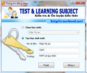 - Nếu đã có HS trong danh sách, chọn HS này bằng cách nháy chọn vị trí Chọn học sinh, tìm học sinh này trong danh sách và nhấn nút Đồng ý. - Nếu cần tạo HS mới thì nháy chọn vị trí Tạo học sinh mới, nhập các thông số của HS này gồm Họ và tên, lớp, trường và nhấn nút Đồng ý. 2. Khách Lệnh này chuyển chế độ người dùng về Khách. Ở chế độ khách, người dùng được quyền thực hiện tất cả các chức năng của phần mềm trử ra việc Kiểm tra định kỳ chính thức để ghi điểm vào Học bạ.