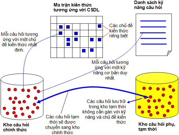 Trong mô hình phần mềm iQB Leo có một đối tượng mới, đó là khái niệm Câu hỏi tạm thời. Vậy Kho câu hỏi tạm thời là gì, chúng có ý nghĩa như thế nào? Vì sao lại cần các câu hỏi này? Trước hết chúng ta cần hiểu khái niệm Câu hỏi tạm thời trong Sơ đồ sau. Câu hỏi tạm thời là gì? - Kho câu hỏi tạm thời được lưu trữ ngay bên trong các CSDL *.iqb, bên cạnh kho câu hỏi chính thức. - Điểm khác biệt duy nhất giữa hai loại câu hỏi này là: các câu hỏi tạm thời khi nhập có thể không cần gán Kỹ năng và Chủ đề kiến thức. Các thông số khác còn lại của câu hỏi tạm thời hoàn toàn giống với câu hỏi chính thức. - Sau khi nhập vào kho TẠM THỜI, các câu hỏi tạm thời này sẽ được chuyển sang KHO chính thức bằng một lệnh riêng của phần mềm, sau khi đã gán Kỹ năng và Kiến thức. Ý nghĩa của câu hỏi tạm thời? - Trong quá trình nhập câu hỏi và CSDL Ngân hàng, việc nhập nội dung thuần không khó, không cần có chuyên môn. Nhưng khâu quyết định nhất cần chuyên môn khi nhập câu hỏi là lúc gán Kỹ năng và Chủ đề kiến thức. Việc gán này đòi hỏi người nhập bắt buộc phải là các GV bộ môn, có kiến thức đối với môn học này. - Ý nghĩa chính của câu hỏi tạm thời là không cần là GV chuyên môn vẫn có thể nhập được câu hỏi tạm thời. Điều này cho phép các nhà trường, Sở/Phòng có thể thuê người ngoài (không phải là GV chuyên môn) để nhập các câu hỏi tạm thời này. Việc này sẽ làm đơn giản hóa công việc nhập dữ liệu câu hỏi cho các cơ sở đào tạo này. - Sau khi nhập câu hỏi tạm thời, có thể mời GV chuyên môn xem, kiểm tra và chuyển các câu hỏi từ kho tạm thời sang chính thức. Khi chuyển như vậy chỉ cần gán thêm Kỹ năng và Kiến thức, công việc này không đòi hỏi nhập lại và sẽ không tốn thời gian. Đó chính là ý nghĩa của khái niệm Câu hỏi tạm thời trong phần mềm iQB Leo.