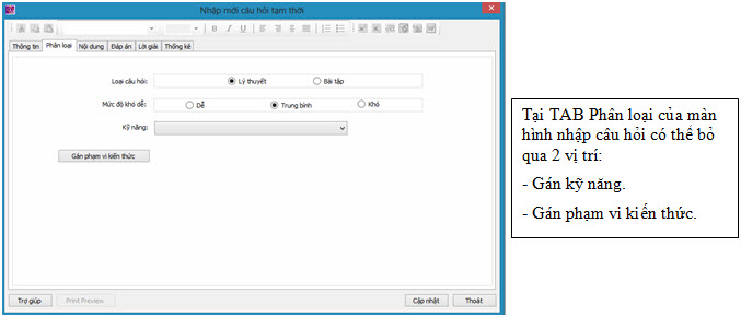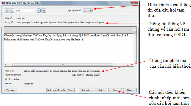 Chức năng nhập câu hỏi tạm thời có giao diện và cách thực hiện hoàn toàn tương tự như lệnh nhập câu hỏi chính của phần mềm. Chỉ có 1 số điểm khác biệt sau: - Trên màn hình chính của lệnh không có hai nút chức năng Đặt lọc & Tìm kiếm và Kiểm tra lỗi logic câu hỏi. - Các câu hỏi tạm thời khi nhập vào CSDL không cần thiết phải nhập đầy đủ thông tin kỹ năng và chủ đề kiến thức của câu hỏi. Chính điều này giải thích cho từ "tạm thời" của các câu hỏi loại này. Các câu hỏi này được nhập vào một kho tạm thời của CSDL, sau đó sẽ được chuyển sang chính thức nếu đã được gán đầy đủ kỹ năng và kiến thức môn học.