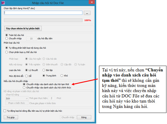 Giao diện màn hình chuyển nhập câu hỏi từ DOC file vào Ngân hàng câu hỏi hoàn toàn giống như khi chuyển nhập vào câu hỏi chính thức. Cần chú ý một vị trí nhỏ trên màn hình này.