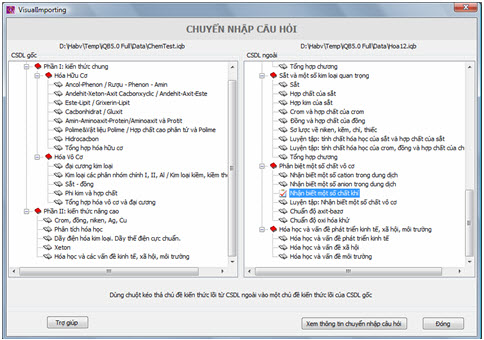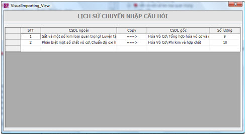 Chúng ta sẽ nhìn thấy gì trên màn hình này: - Bên trái là Ma trận kiến thức của CSDL chính, gốc. - Bên phải là Ma trận kiến thức của CSDL ngoài, là CSDL mà chúng ta đang muốn chuyển nhập câu hỏi vào CSDL gốc. Thao tác như sau: Phần mềm sẽ cho phép sao chép toàn bộ các câu hỏi tương ứng với một chủ đề kiến thức lõi của CSDL ngoài vào một chủ đề lõi của CSDL gốc. Để thực hiện việc này, người dùng sẽ dùng chuột kéo thả từ 1 chủ đề lõi bên phải sang 1 chủ đề lõi bên trái, đó chính là thao tác chuyển nhập, sao chép câu hỏi. Khi thao tác được thực hiện xong phần mềm sẽ thông báo kết quả ở dòng phía dưới màn hình. Có thể thực hiện nhiều thao tác liên tục trong lệnh này. Để xem lại toàn bộ công việc đã thực hiện nháy nút . Cửa sổ có dạng như hình sau liệt kê toàn bộ công việc chuyển nhập đã thực hiện của lệnh này.