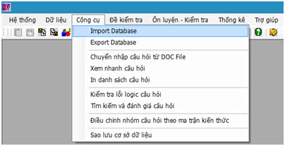 Trong phần mềm iQB, lệnh Import dữ liệu được thiết kế cẩn thận để hỗ trợ tối đa các thao tác chuyển nhập dữ liệu trên thực tế. - Khi chuyển nhập dữ liệu câu hỏi từ một CSDL ngoài vào CSDL hiện thời, hai tệp CSDL này không nhất thiết phải có mã dữ liệu như nhau. - Trong trường hợp hai CSDL này có mã giống nhau, nghĩa là chúng cùng xuất phát từ một CSDL gốc nào đó, việc chuyển nhập câu hỏi có thể chuyển thẳng vào Danh sách câu hỏi chính thức. - Trường hợp hai CSDL có mã khác nhau thì việc chuyển nhập câu hỏi từ CSDL ngoài sẽ chuyển tạm vào DS câu hỏi tạm thời để xử lý sau. - Người dùng có thể thực hiện thao tác chuyển đổi dữ liệu trực tiếp ngay trên màn hình bằng phương pháo kéo thả chuột rất thuận tiện. Như vậy với lệnh Import dữ liệu, các giáo viên, nhà trường có quyền chia sẻ và chuyển nhập dữ liệu từ các nguồn CSDL khác nhau bất kỳ không phụ thuộc vào xuất xứ của dữ liệu cần chuyển nhập. Các bước thực hiện: Từ thực đơn Công cụchọn Inport Database hoặc dùng nút trên thanh công cụ.
