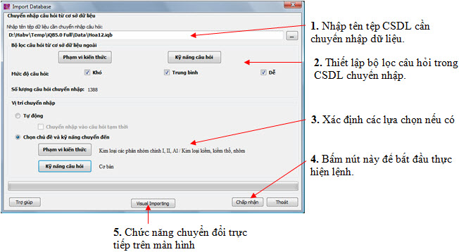 Các bước thực hiện tiếp theo: - Nhập tên CSDL cần chuyển nhập dữ liệu câu hỏi. Có thể dùng nút để lựa chọn tệp CSDL cần lấy dữ liệu. - Thiết lập bộ lọctrong CSDL cần chuyển nhập dữ liệu. Bộ lọc câu hỏi bao gồm Phạm vi kiến thức, Kỹ năng câu hỏi và mức độ khó – dễ của câu hỏi. Việc thiết lập bộ lọc này tương tự như trong lệnh Xuất dữ liệu đã trình bày ở trên. - Xác định kiểu chuyển nhập dữ liệu. Có hai kiểu chọn: Chế độ tự động. Mặc định kiểu chuyển nhập dữ liệu là Chuyển nhập vào DS câu hỏi tạm thời. Trường hợp CSDL chuyển nhập có mã trùng với CSDL hiện thời thì được phép lựa chọn . Trong trường hợp này các câu hỏi với phạm vi kiến thức và kỹ năng đã có trong CSDL hiện thời sẽ được chuyển thẳng vào DS câu hỏi chính thức. Chọn chủ đề và kỹ năng câu hỏi chuyển đến. Cho phép người dùng chọn một chủ đề kiến thức lõi và kỹ năng để chuyển nhập vào câu hỏi chính thức với chủ đề và kỹ năng này. Nháy các nút Phạm vi kiến thức và Kỹ năng câu hỏi để chọn thông tin tương ứng. Kích nút Chấp nhậnđể xác nhận và thực hiện việc chuyển nhập dữ liệu, kích Thoát để đóng cửa sổ lệnh. Quá trình chuyển nhập dữ liệu có thể kéo dài trong một vài phút hoặc lâu hơn phụ thuộc vào kích thước của CSDL chuyển nhập thông tin. Chức năng Visual Importing Đây là tính năng mới nhất của phần mềm iQB Leo. Chức năng này cho phép người dùng chuyển nhập dữ liệu một cách trực quan chỉ bằng một vài thao tác kéo thả chuột đơn giản. Nháy nút trên giao diện chính của lệnh để vào chức năng này. Màn hình Chuyển nhập câu hỏi trực tiếp có dạng như hình dưới đây.