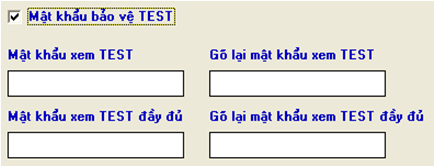 - Mật khẩu của TEST: mỗi TEST có thể đặt chế độ có mật khẩu bảo vệ. Có 2 mức đặt mật khẩu. Mức 1: mật khẩu xem (chỉ đọc), mức 2: mật khẩu đầy đủ (xem và ghi). Khi người dùng mở một TEST ra để làm việc, tùy thuộc vào các tình huống khác nhau mà phần mềm sẽ xác định được quyền của người sử dụng này đối với TEST hiện thời. Xem thêm phần Kiểm tra trực tuyến để hiểu thêm về các quyền này và về cách xử lý của phần mềm.