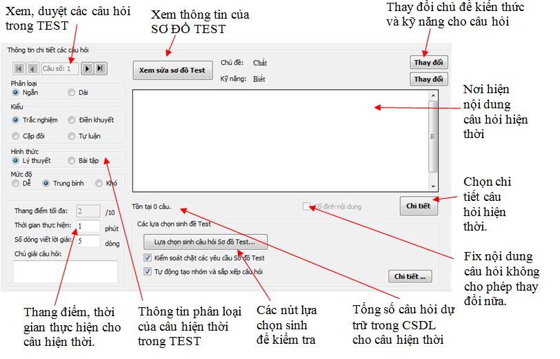 Với mỗi câu trong TEST, người dùng có thể thực hiện các thao tác thay đổi chủ đề kiến thức, kỹ năng, thay đổi các thông số liên quan đến câu hỏi này hoặc có thể tiến hành duyệt và chọn trực tiếp từng câu hỏi theo ý muốn. Cụ thể với mỗi câu hỏi có thể thực hiện các thay đổi sau: