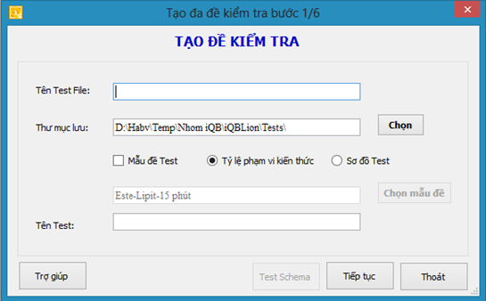 - Chọn kiểu khởi tạo Test là theo Tỉ lệ phạm vi kiến thức hay theo Sơ đồ Test.