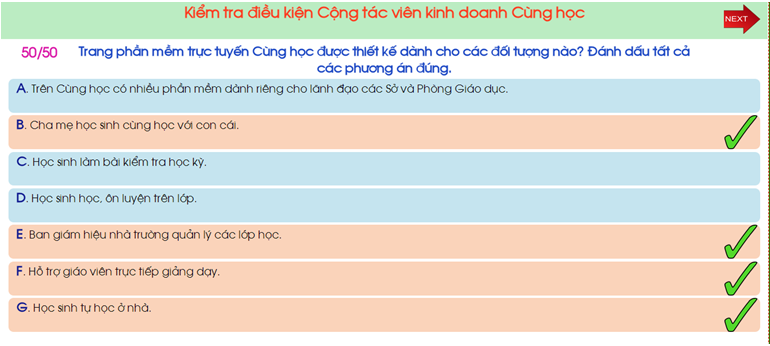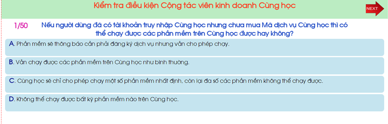 Người ứng viên phải làm lần lượt và tất cả 50 câu hỏi. Làm xong 1 câu nháy lên nút NEXT để chuyển sang câu tiếp theo.