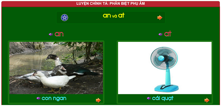 Với mỗi cặp âm vần sẽ thể hiện 1 từ và hình ảnh có liên quan. Có thể xem các từ khóa khác bằng cách nháy vào nút mũi tên phía dưới màn hình. Tất cả các từ khóa đều có hình ảnh và âm thanh kèm theo.
