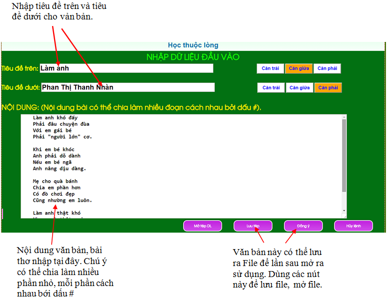 Giáo viên có thể nhập trực tiếp văn bản, bài thơ trong 1 cửa sổ nhập dữ liệu để tạo cho mình các bài luyện học thuộc lòng. Màn hình nhập dữ liệu có dạng như hình sau: