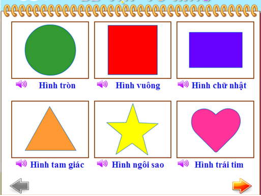 Trên màn hình là các hình cơ bản muốn cho trẻ làm quen. Có thể nghe được cách gọi các hình này bằng cách nháy vào các nút hình loa phía dưới.